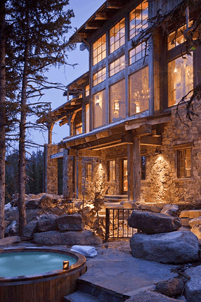 15,500-square-foot hewn timber and stone lodge on 160 acres in Big Sky, Montana, adjacent to the Yellowstone Club. Designed by Miller-Roodell Architects, Bozeman.